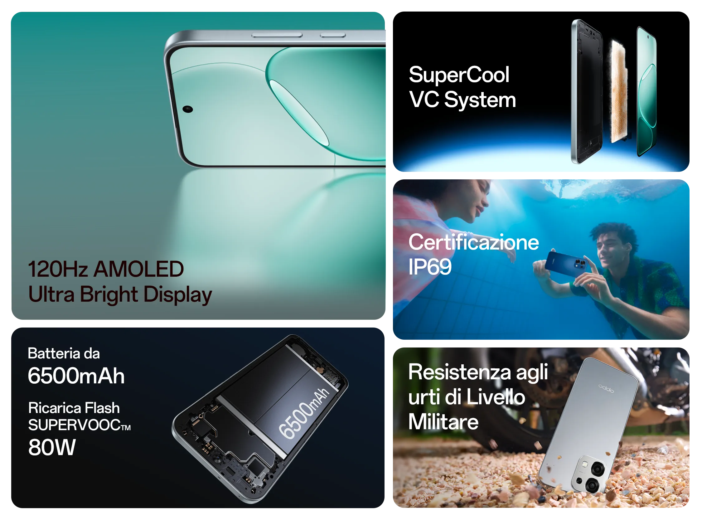 OPPO A6 Pro 5G è dotato del protocollo IP69. Questa certificazione consente al dispositivo di resistere a getti d'acqua ad alta pressione e temperatura, fino a 80°C, ideali per condizioni estreme come la pioggia battente o ambienti polverosi. Puoi immergerlo fino a 1,5 metri per 30 minuti senza compromettere le prestazioni e le nuove funzionalità dedicate alla fotografia subacquea, permettono di realizzare scatti senza doversi preoccupare di nulla.