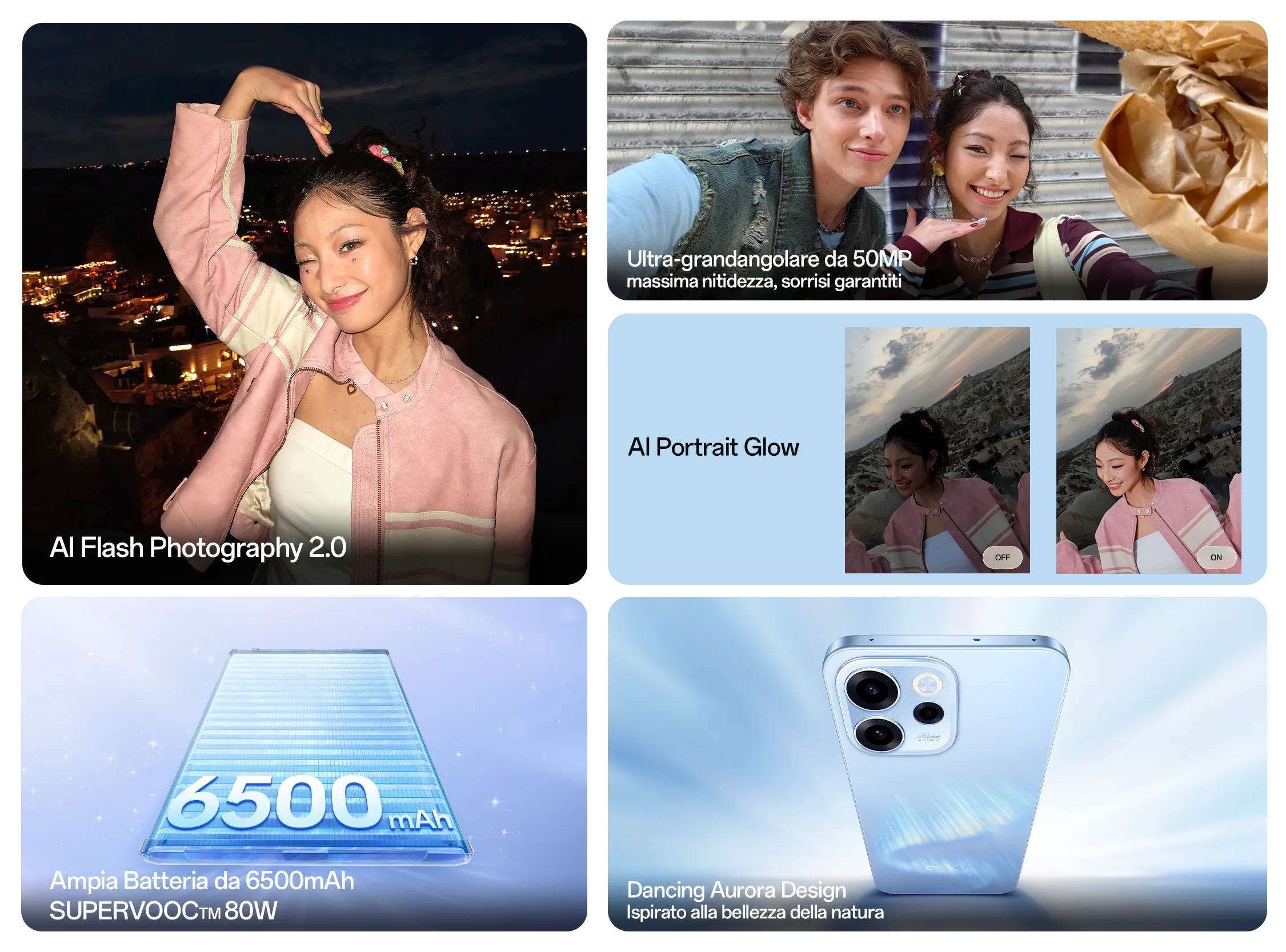 Sei stanco di foto buie, sovraesposte o con quei terribili "occhi rossi"? Reno15 F è il Re della ‘’Flash Photography’’! Grazie ad AI Flash Image 2.0, l’intelligenza artificiale analizza le condizioni di luce ambientale e applica un’ illuminazione intelligente sia sulla fotocamera frontale che su quella posteriore. Il risultato? Volti luminosi e naturali, senza il classico effetto "fantasma", con tutti i dettagli dello sfondo preservati anche in condizioni di luce complessa come luci rosse o gialle. L'esclusivo Front Screen Flash trasforma lo schermo in una luce di riempimento personalizzabile per colore e intensità - perfetto per selfie perfetti in situazioni di luce difficile. Mai più foto scure o sovraesposte: con Reno15 F, ogni momento notturno diventa un'opportunità perfetta.