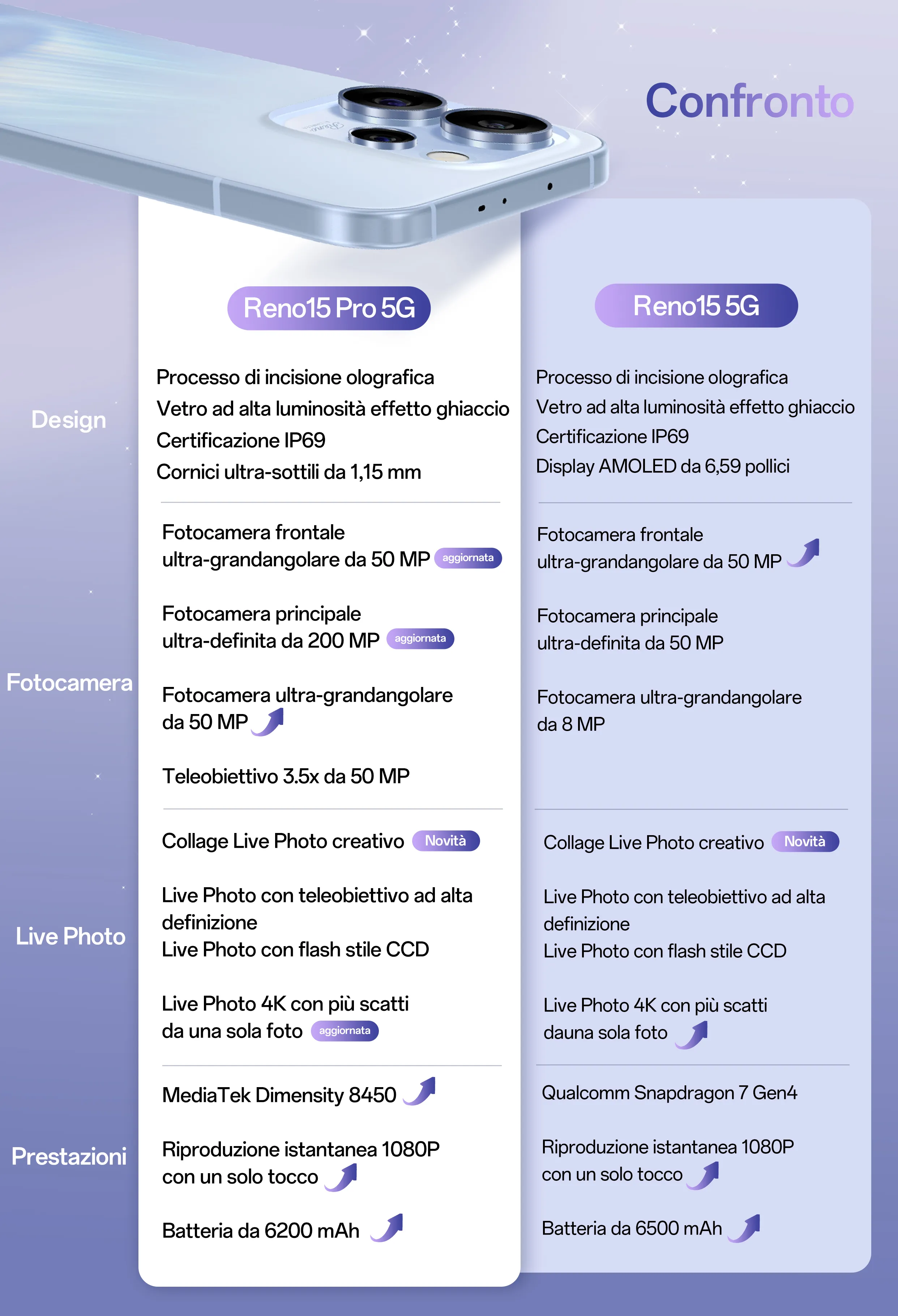 Reno15 Pro non è solo uno smartphone, è una dichiarazione di stile. Il rivoluzionario Dancing Aurora Design con vetro scolpito a freddo e frame in alluminio aerospaziale crea riflessi aurora 3D che cambiano ad ogni angolazione con l'effetto. La texture brevettata cattura la luce come l'aurora boreale, rendendolo un accessorio impossibile da non notare. Ma la bellezza non compromette la sostanza: con la certificazione IP69, che garantisce estrema resistenza a liquidi e polvere, puoi portarlo ovunque. La batteria da 6200mAh alimenta le tue intense giornate di riprese, mentre la ricarica SUPERVOOC 80W ti riporta al 100% in meno di un'ora. Ed infine, la RAM da 12GB (esp.+12), la memoria d’archiviazione da 512GB ed il nuovo processore MediaTek 8450 a 4nm, garantiscono un utilizzo costante al massimo della potenza.
