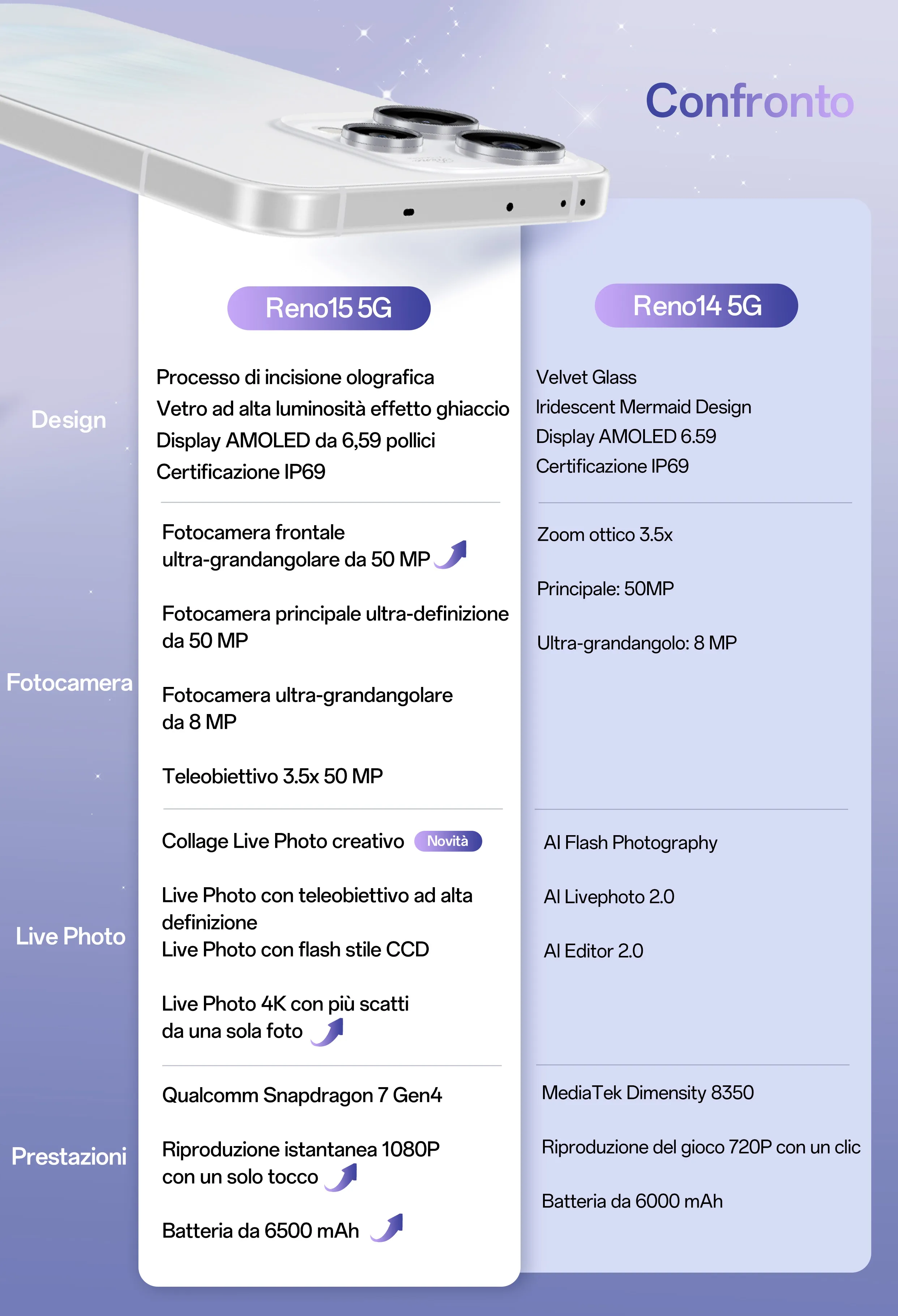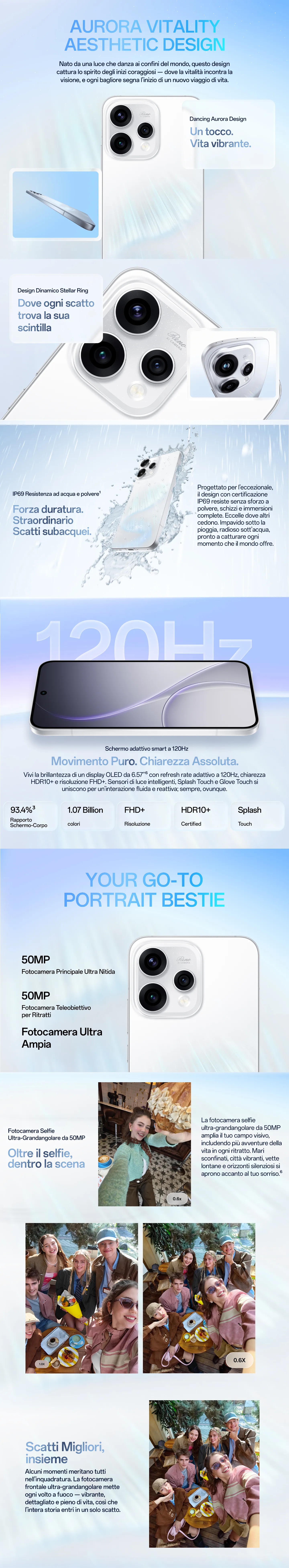 Reno15 integra il rivoluzionario Dancing Aurora Design con vetro scolpito a freddo, frame in alluminio aerospaziale e riflessi 3D che cambiano ad ogni angolazione. La texture brevettata cattura la luce come l'aurora boreale, rendendolo un accessorio impossibile da non notare. Ma la bellezza non compromette la sostanza: con la certificazione IP69, che garantisce estrema resistenza a liquidi e polvere, puoi portarlo ovunque. La batteria da 6500mAh alimenta le tue intense giornate di riprese, mentre la ricarica SUPERVOOC 80W ti riporta al 100% in meno di un'ora. Ed infine, la RAM da 8GB (esp.+18), la memoria d’archiviazione da 512GB ed il nuovo processore Qualcomm Snapdragon 7 Gen4, garantiscono un utilizzo costante al massimo della potenza.